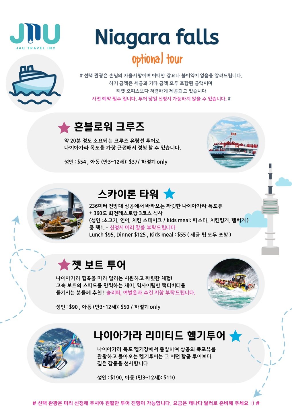 • 선택관광 (혼블로워 크루즈, 헬기투어, 젯보트, 스카이론타워)